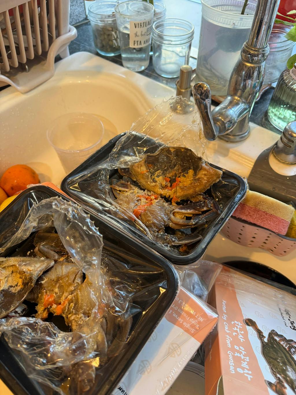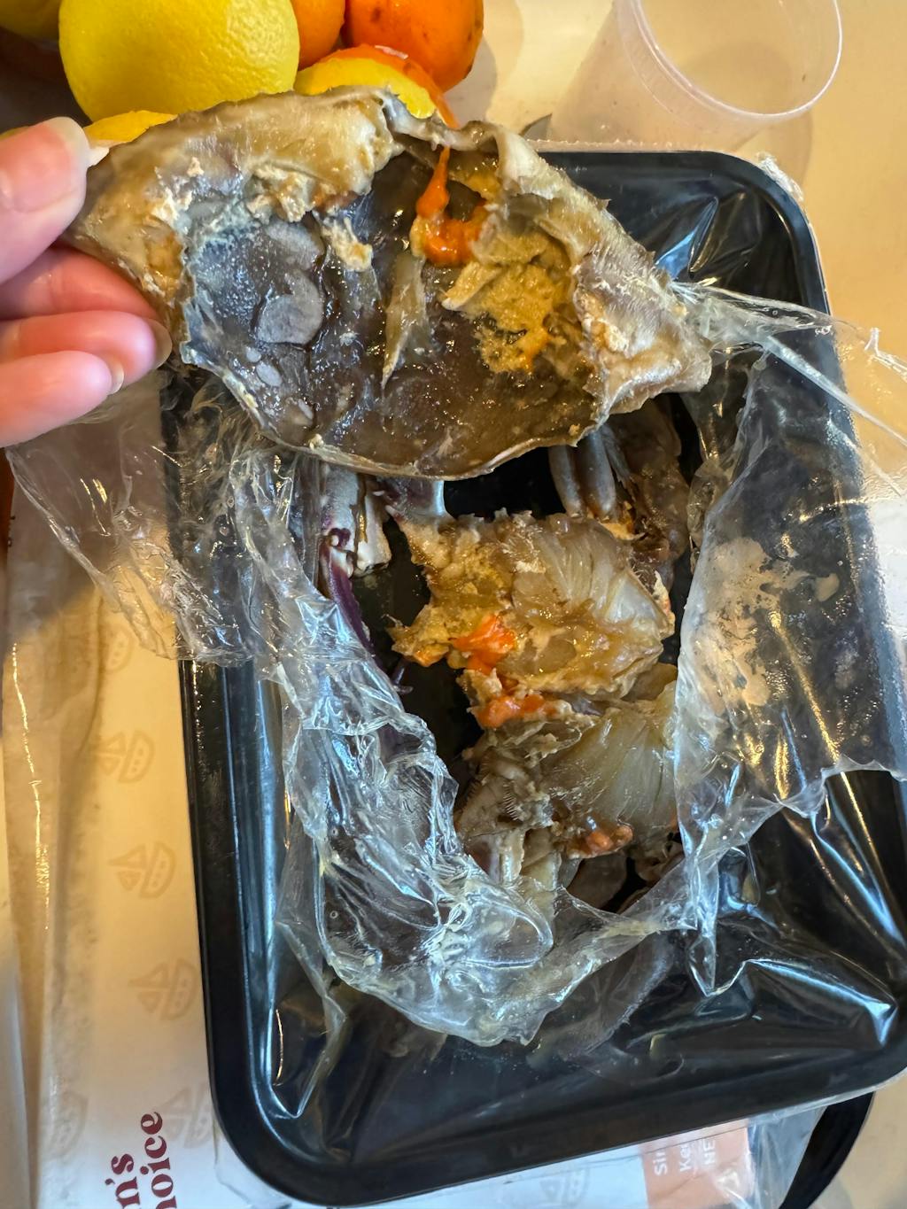 The first time I ordered it it was really really good. I didn’t even care it was $25 for 1 crab. Thinking it would be same this time - wrong. Why open the crab take out sack and put it back? Pic shows whole crab and that is what we want. Crab is crushed. No soy sauce at all. Plastic wrapping instead of the containers. Quality of crab is questionable and not appetizing and not sure if it’s fresh at all. Wishes I read the reviews before re ordering. I ordered $200 worth of crabs!!!! What a let down. I was so excited to receive them and toss all the packaging so hard now to return them for a refund!
